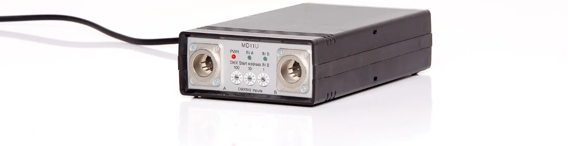 Der MD11U ist ein DMX512 Merger, der zwei DMX512 Linien per HTP, LTP oder exklusiv zu einer Linie verknüpfen kann, das Ergebnis aber an zwei unabhängigen Ausgängen zur Verfügung stellt. Sofern die Drehkodierschalter auf 000 oder 001 stehen wird Kanal 1 Linie B mit Kanal 1 Linie A verknüpft, andernfalls beginnt die Verknüpfung des Kanal 1 der Linie B ab dem eingestellten Adressoffset mit der Linie A.