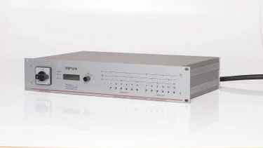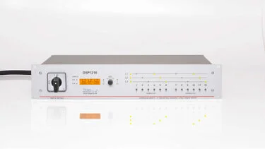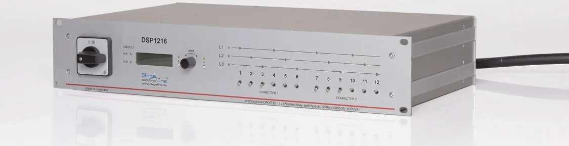 The DSP1216 is a DMX512 controled Relay switchpack, which has basicly a 400V/16A three phase Mains supply with a maximum distribution power of 11kVA. The relay contacts has a nominal current of 20A and an inrush current of 70A, so that fuses at the load outputs are not necessary. Further on the DSP1216 has a 3 phase power switch for the Main supply. As a special feature there is a 4 line Mains filter where the hole supply- and load- current is going through.