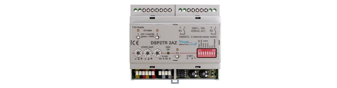 This is a very special DMX512 controlled switch pack not only with relays for high currents. Using special SSR (solid state relays) in a precision timing to the relays the DSP2TR-2AZ is able to reduce high momentary inrush currents as usual with DC-supplies or LED fixtures.