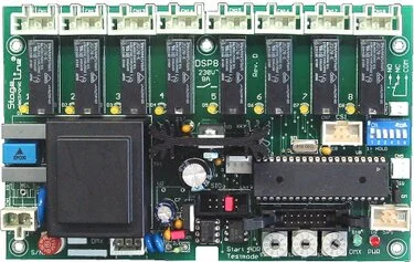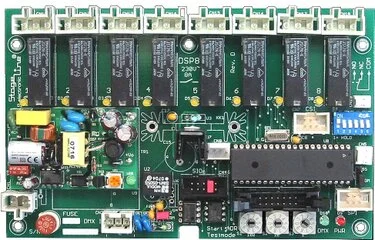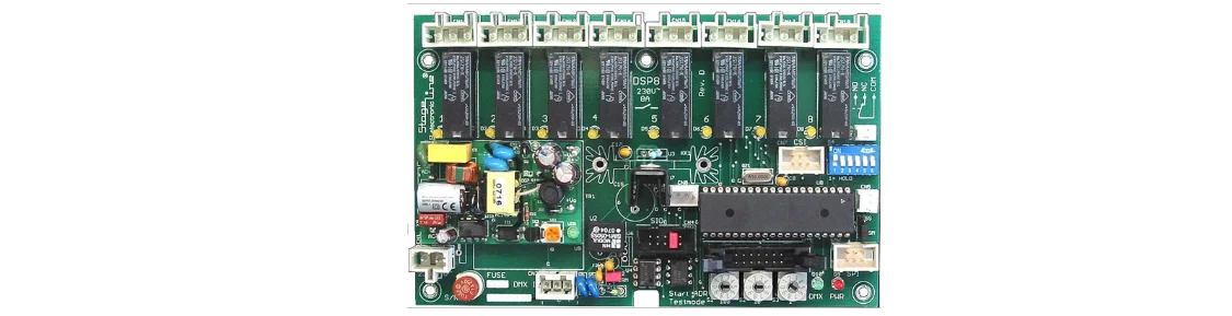 The DSP8-pcb is a DMX512 controlled 8 channel SPDT relay switch board with Wago CageClamp plug connectors. Each relay hat as SPDT contact which is a capable of 8A @250V~ nominal power. A lot of special functions like mutual trigger, blind and curtain control and a sequencer are selectable by the three rotary code switches and the 8 times DIP-switch.