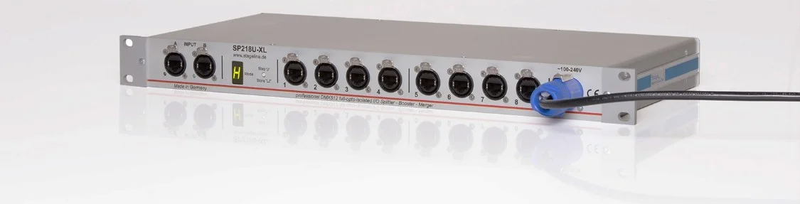 The SP218U-XL has two groups of modes. Subdivided into six Splitter/Booster and seven Merger modes. In Splitter/Booster mode one DMX512 universe can be be distributed and strengthened into eight outputs or two DMX512 universes into four outputs each. All inputs and outputs are fully isolated against each other and ground lifted. ! IN A to Out 1 and IN B to Out 5 can be configured also differently.