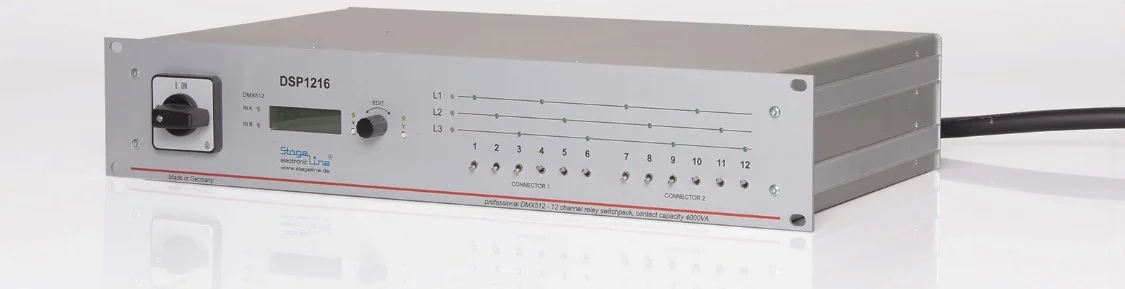 Under control, 19”, 2U, 12x 16A, 1-3 phase supply, Mains voltage monitoring, reverse polarity protection, Harting connectors, 2x DMX512 IN merger, override switches